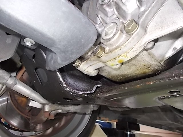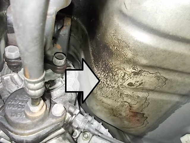 BNR32、33, 34 共にこの部分にオイルが付着するケースが多いです!これはミッション上部に取り付けられているシフトの部分から内圧で吹いたオイルが滲んだものです。問題はないのですがオイル汚れはGTRには似合わないので綺麗にして上げます。