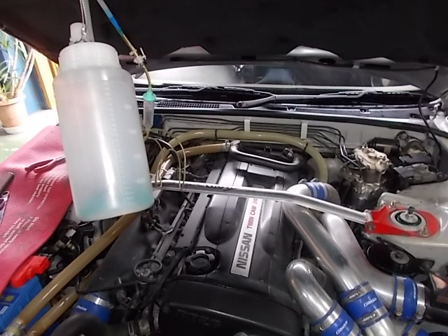 エンジンルーム内のパイピング類からのエア漏れをチェックです。パイピングのズレから抜けてるケースもあります。