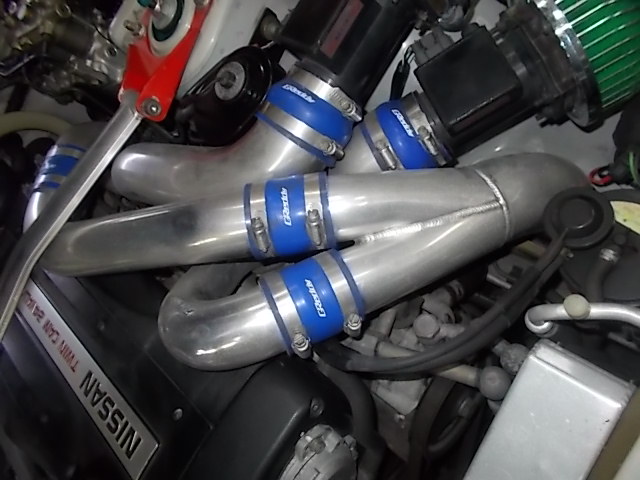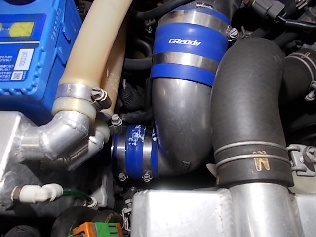 先ずはインタークーラーパイピングのホース抜けをチェックします。この車は社外アルミパイピングが入っているので抜けづらいですが純正品はゴム質であるのでゴムが硬化してホースバンドの締め付けが緩くなって抜けやすくなっているのでチャックですよ!!!