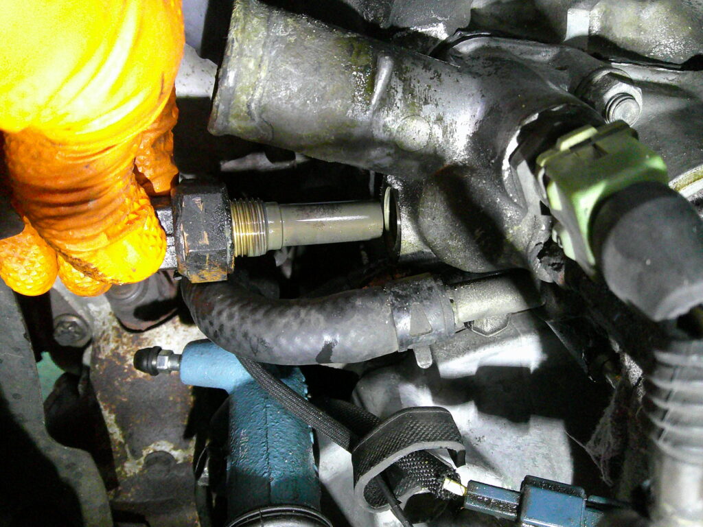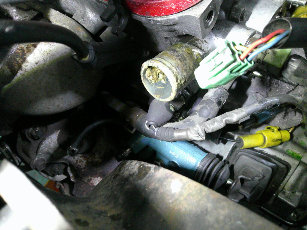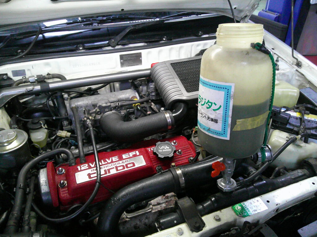 サーモスタット交換、クーラントの入替も行いますが、少しオイルが混じっていることを発見しました。年式的な問題でもあると思われますが、ヘッドとブロックとの間にはヘッドガスケットが挟まれています。ピストンと燃焼室を守っている部分、オイル通路を守っている部分、そして水の通路を守っている部分です。これらの中でオイル通路と水の通路が交わってしまうとこのように水にオイルが混じってしまいます。