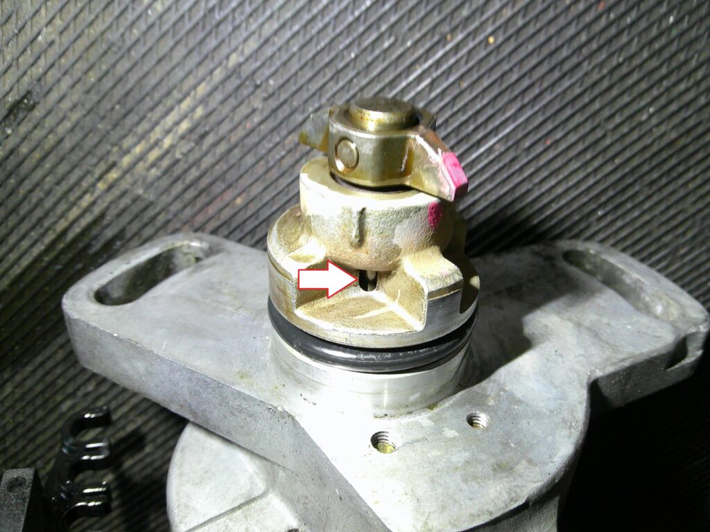 この穴の奥にはベアリングがありベアリングが焼き付かないようにオイル穴があるのですが、このオイルがデスビキャップ側に行かないようにオイルシールがくみこまれていますがそれが駄目になっていたのでしょう・・・!