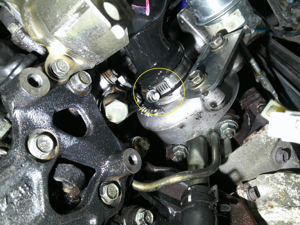 オイルパン取り付け面とフロントオイルシール近辺にオイル滲みが有ったので点検してみると、どうやらエアコンコンプレッサーの上側の気配が・・・・ってことでコンプレッサーを外し点検しました。すると原因はサクションパイプ用ホースバンドが締められていませんでした。サクションパイプ内に溜まるオイル類(ブローバイ&バックタービン内圧)がこぼれてオイルパンに伝わっていました。